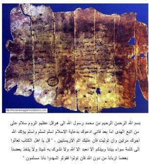 Dengan menyebut nama Allah Yang Maha Pemurah lagi Maha Penyayang. Dari Muhammad utusan Allah untuk Heraclius Kaisar Romawi yang agung. Salam bagi siapa yang mengikuti petunjuk. Salain dari pada itu, sesungguhnya aku mengajak kamu untuk memeluk Islam. Masuklah kamu ke agama Islam maka kamu akan selamat dan peluklah agama Islam maka Allah memberikan pahalah bagimu dua kali dan jika kamu berpaling maka kamu akan menanggung dosa orang orang Romawi. “Katakanlah: Hai Ahli Kitab, marilah (berpegang) kepada suatu kalimat (ketetapan) yang tidak ada perselisihan antara kami dan kamu, bahwa tidak kita sembah kecuali Allah dan tidak kita persekutukan Dia dengan sesuatu pun dan tidak (pula) sebagian kita menjadikan sebagian yang lain sebagai tuhan selain Allah. Jika mereka berpaling maka katakanlah kepada mereka: “Saksikanlah, bahwa kami adalah orang-orang yang berserah diri (kepada Allah)”. Al-Imron 64
